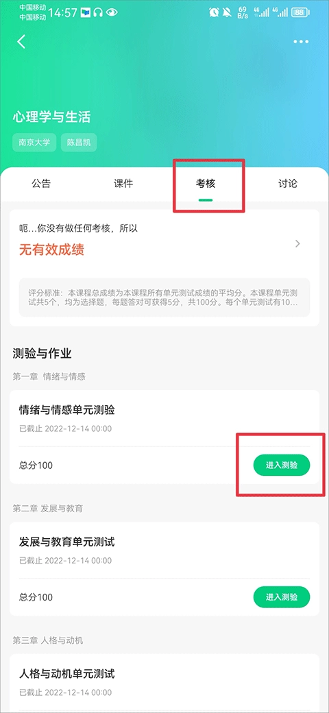 2、进入后,在考核板块的测验与作业对应的章节中点击进入测验