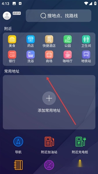 2、该应用的首页设有搜索栏,支持地点搜索与路线查询,同时还会展示周边的美食、药店等各类场所信息,并且配备了常用地址添加功能,能帮助用户更便捷地查找和管理地址。