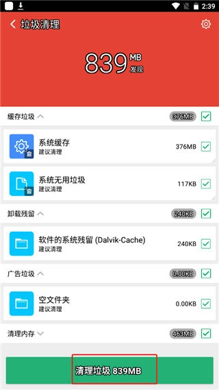 2、它会自动为用户搜索出手机中的无用垃圾,点击即可清理。