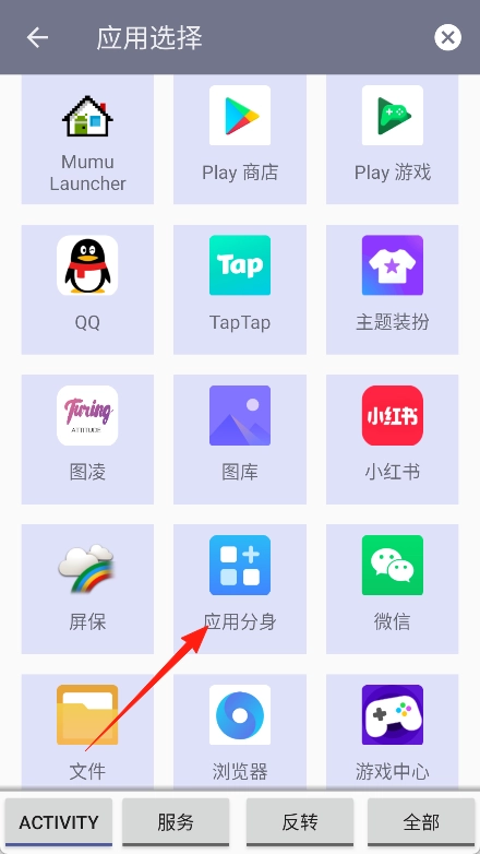 4、选择手机上安装的一个应用程序,例如“应用分身”。