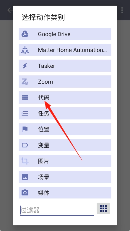 6、点击右下角的加号选择动作类别,例如“代码”。