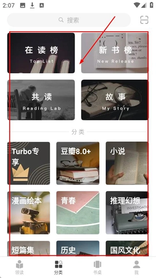 1、在分类页面,可浏览在读榜、小说等板块,找到感兴趣的书籍分类啦。