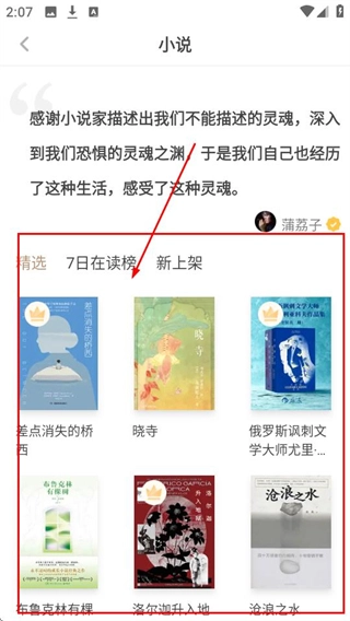 2、进入小说分类后,可浏览精选、7日在读榜等书籍列表,找到心仪的书籍哦。