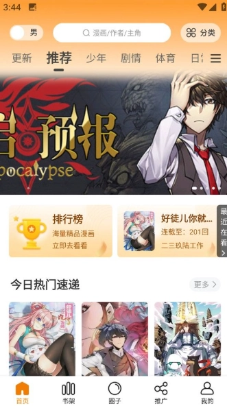 1、打开App后,即可浏览推荐漫画或搜索想看的漫画。