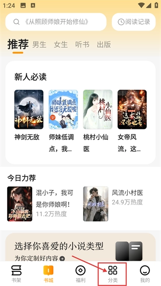 在首页,点击底部的【分类】按钮,进入分类页面后即可查找各类不同类型的小说。