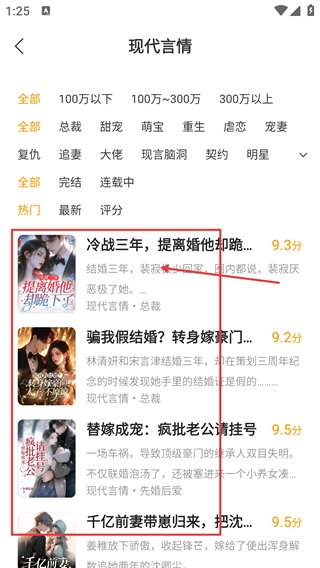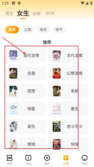 进入分类页面后,在【女生】分类下,挑选像【现代言情】这类小说类型,就能进入对应的类别小说列表页面。
