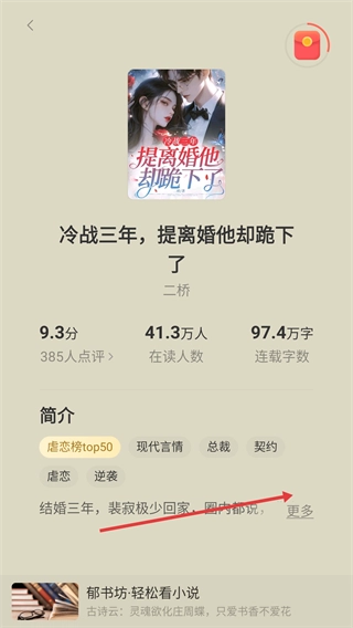 在小说详情页面,能够查看小说的评分、正在阅读的人数、连载的字数等相关信息,点击【更多】按钮可以查看完整的小说简介,在了解小说的具体内容之后就能够开始阅读了。