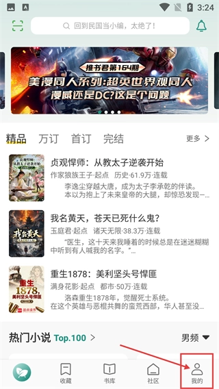 打开软件的首页后,你可以借助搜索功能来查找小说,也能浏览【精品】【万订】之类的分类小说,点击底部的【我的】就能进入个人页面。