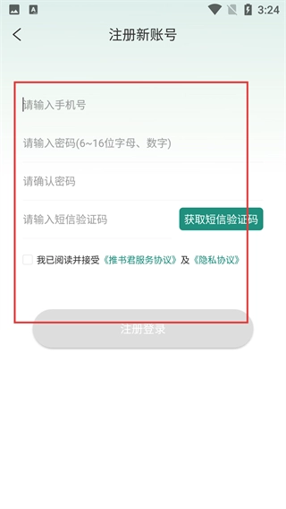 进入新账号注册页面后,按顺序填写【手机号】【密码】【确认密码】,接着获取并输入短信验证码,最后勾选同意相关协议即可完成注册流程。