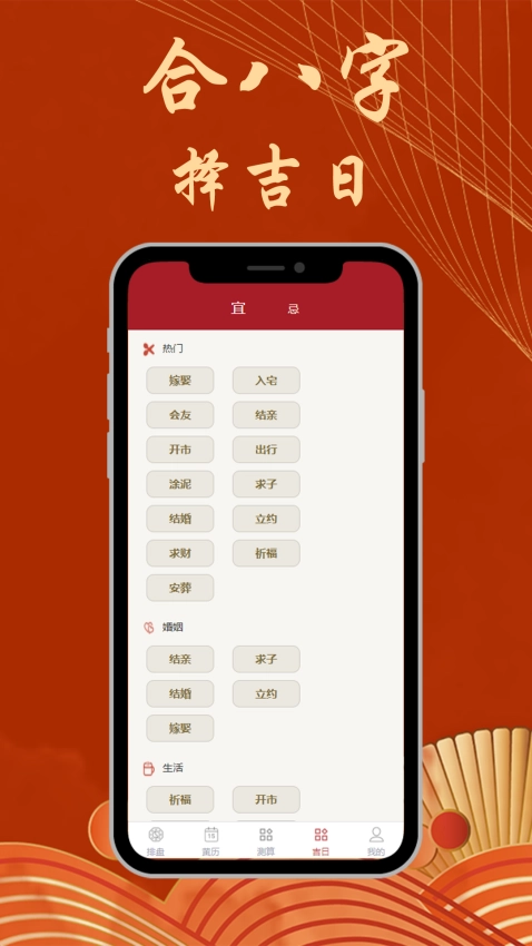 方便用户随时在此查询各类适宜办事的吉利日子,以求得平安顺遂、吉祥如意。