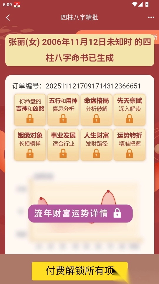 最后点击“付费解锁所有项”功能,就能查看你的八字算命结果了。