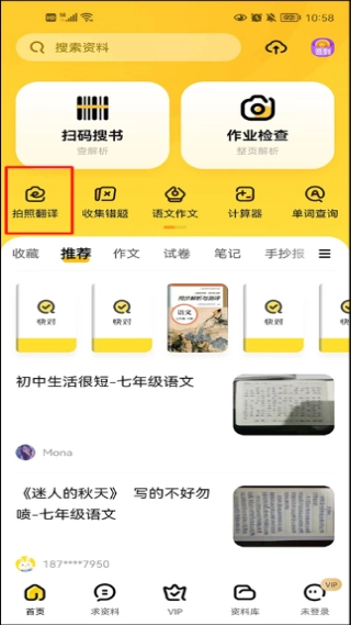 用户选择要翻译的类型,包括试卷、文本以及相册等。