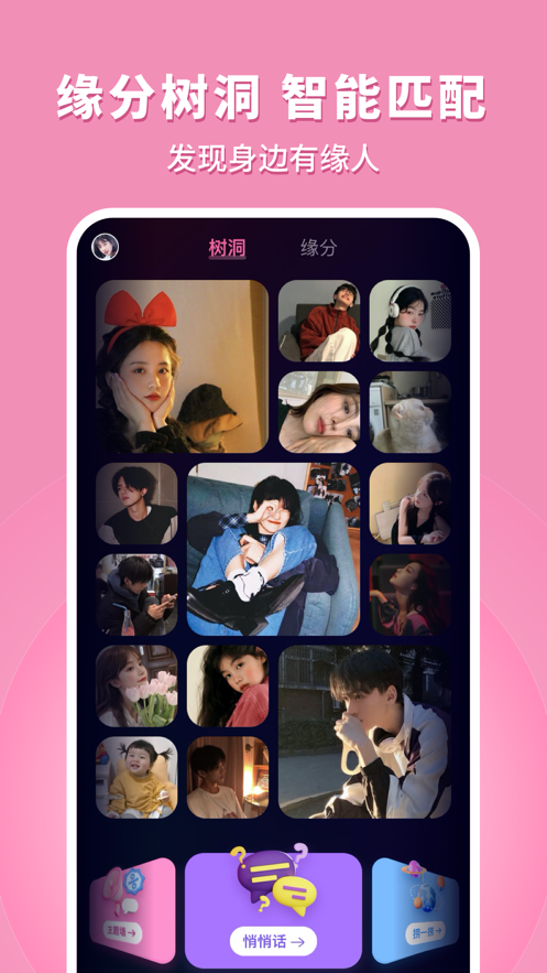 1、缘分树洞,智能匹配,你所看到的人,都是懂你的人,赶紧加入灵魂匹配吧;