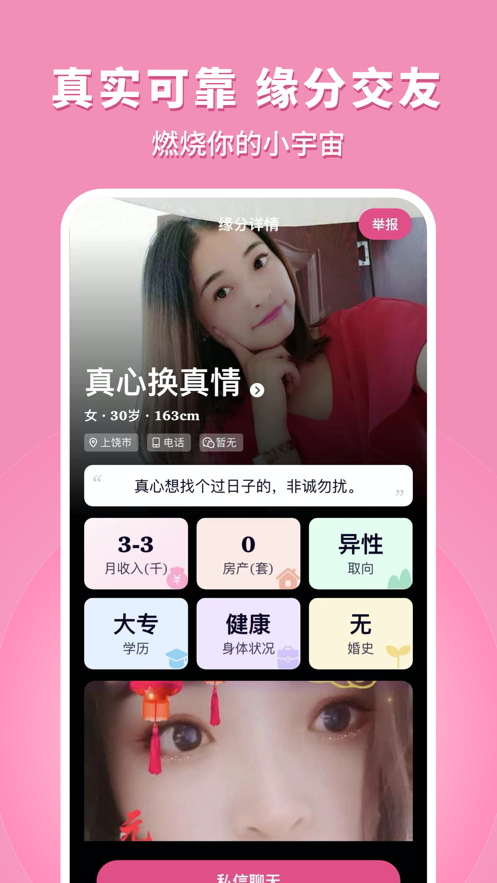 真实可靠,缘分交友,燃烧你的缘分,找到你的有缘人,智能匹配轻松交友,匿名聊天,发现所有的伪装,将你内心的柔软、郁闷和不爽全部倾诉出去,你会发现心情会好很多,紧绷的神经也会放松不少!