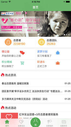 根据每年在四川的志愿者人数和活动时间形成支持统计,查看各种活动,在线注册参加志愿服务,