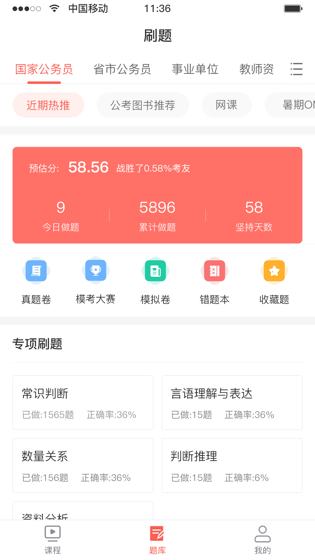 2、涵盖多项考试类型:公务员、事业单位、教师等招聘考试领域、学习计划、知识卡、直播课、真题库、、智能刷题等。