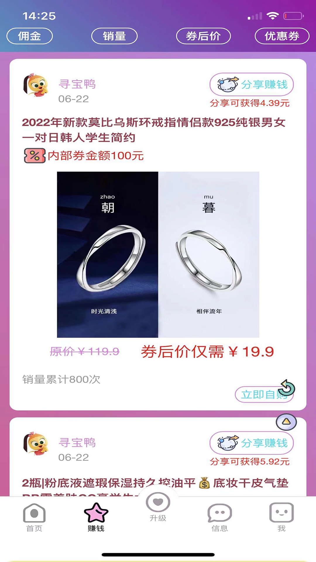 1、寻宝鸭是一款自购省钱+分享赚钱的电商导购APP。