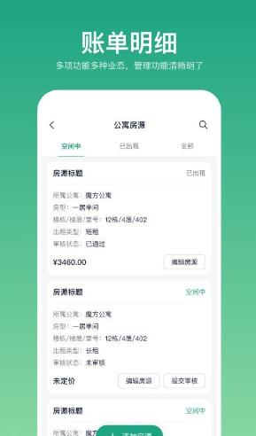 3、账单明细一目了然,租金、房屋状态、房屋信息和租客信息尽在掌握。