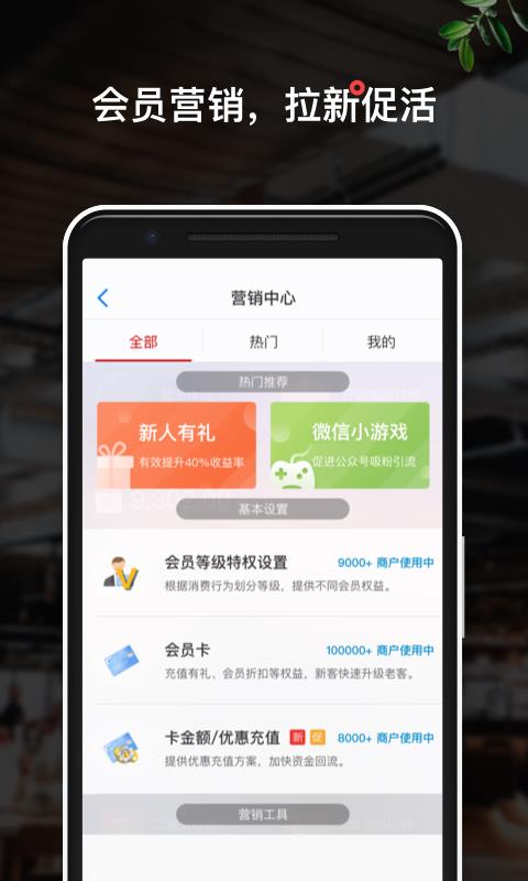 1、轻松发起各种活动,提供优惠券、促销活动、电子会员卡等营销工具。