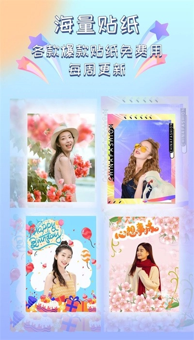 1、汇聚了很多爆款贴纸,不仅可以直接免费用,而且每周还会及时为大家进行更新,各种有趣特效都可以体验到。