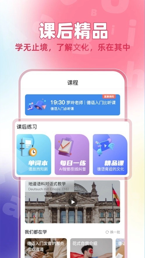 2、让用户从听说读写四个方面全面加强自己的德语能力。