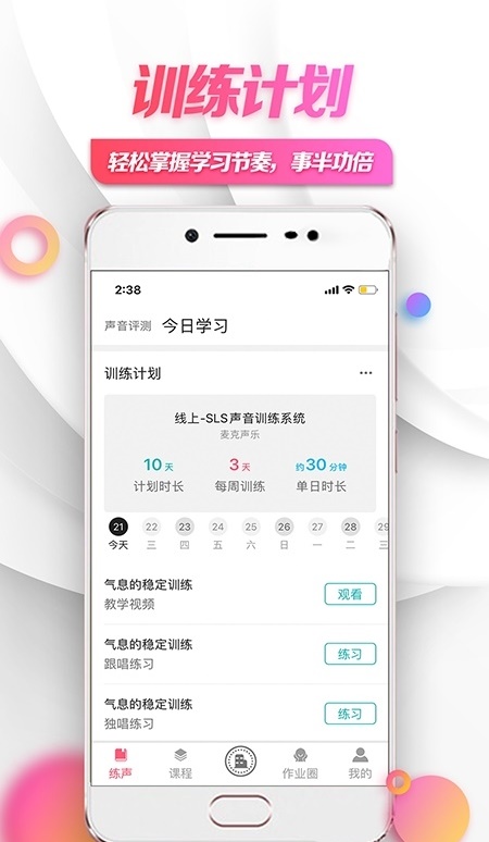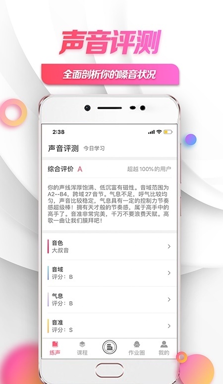 1.软件中加载了声音测评功能,可以根据用户的声线为用户量身定制相应的声乐训练计划。