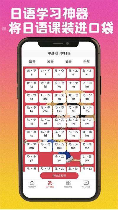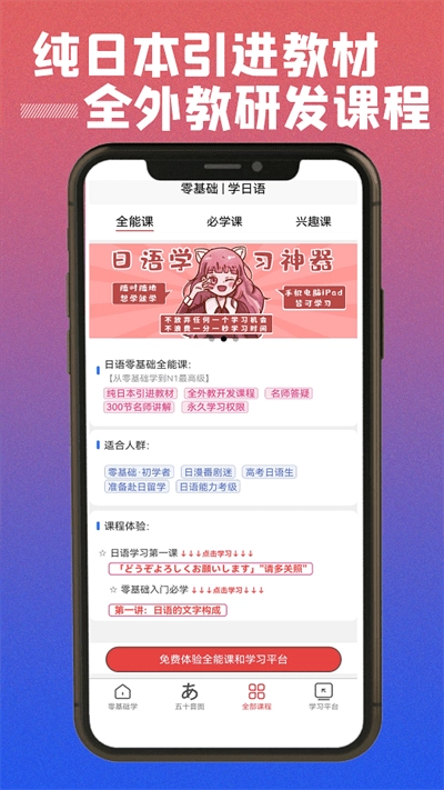 1、是一款免费的日语学习软件,软件内设多种日语基础必学内容。