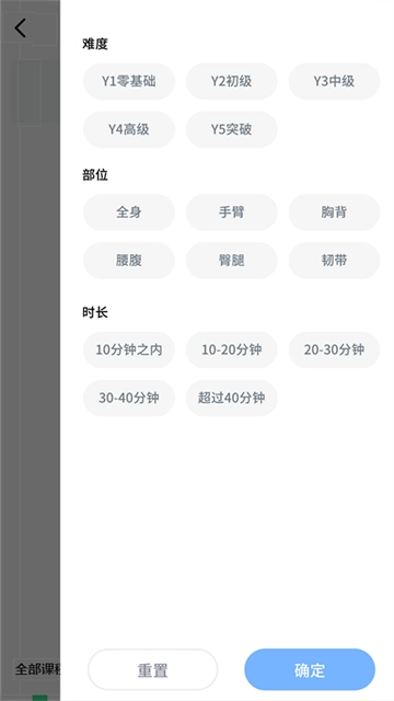 5、用户可以根据自己的身体情况,来选择课程,而运动的部位也会详细的划分,大到全身,小到韧带,时常控制可以快速查找你所需要的课程。