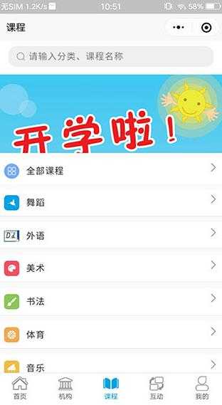 5、主页中支持家长搜索名称查找课程,新的消息会及时通知到手机,及时查看。