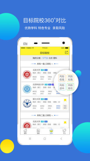 目标院校对比:全方位对比目标院校,排名、重点学科、特色专业、建校时间、就业趋势、男女比例、校园环境、录取分数等等,360度无死角。