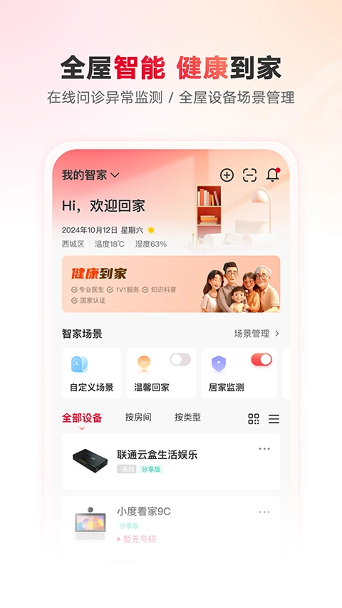 联通智家是一款智能家居掌上管理软件,具有智能家居、数据存储、业务查询、家庭娱乐等丰富功能,结合智能家居连接控制,提供智能生活的整体解决方案,给用户更智能的家庭生活体验。