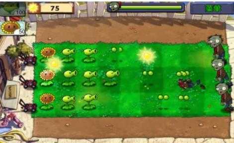 2.合理摆放豌豆射手等进攻型花卉和土豆墙等防御型植物,抵御丧尸大军的进攻。