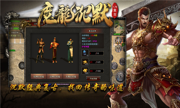 魔龙沉默176复古是一个沉默版本的传奇主题游戏,以魔幻世界为背景,让玩家扮演不同的角色,探索未知的世界,完成各种任务和挑战。游戏中的角色种类繁多,包括战士、法师、盗贼等多种类型,每种角色都有不同的属性和技能。玩家可以根据自己的喜好和游戏需求,选择合适的角色进行操作。