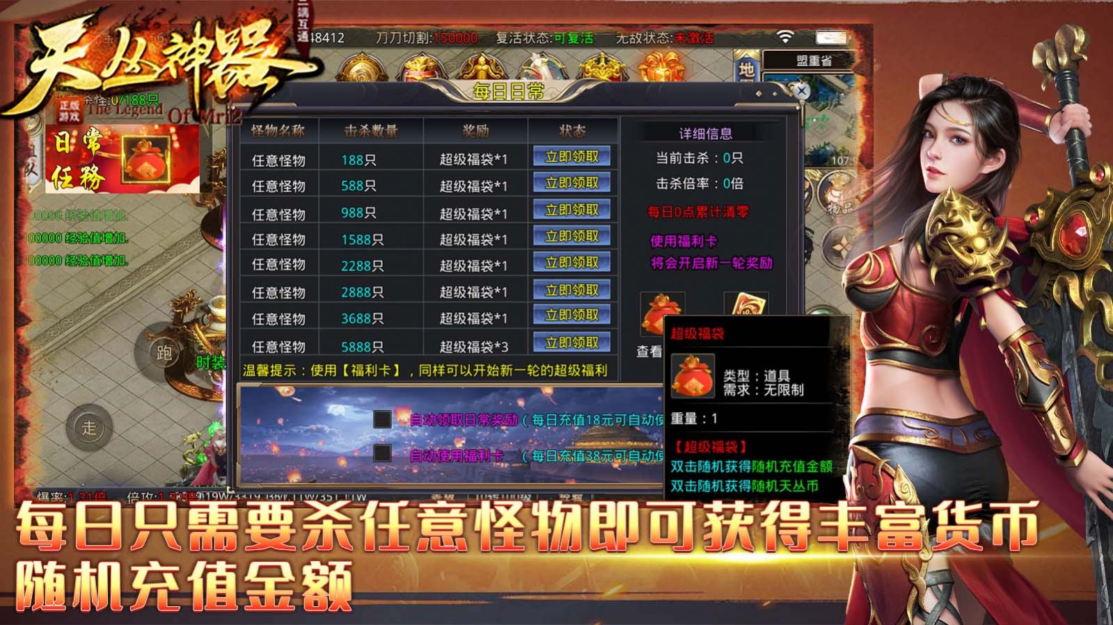 1、每日只需要杀任意怪物即可获得丰富货币,随机充值金额等,福利超丰厚!