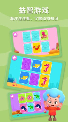 3、翻一翻海洋动物卡片,学习动物的名字。每次重新开始,你都可以认识新的动物朋友。