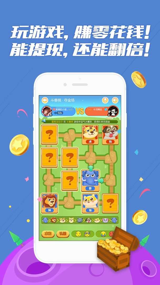 新增夺金游戏——斗兽棋,玩游戏挣零花钱,能提现可翻倍。