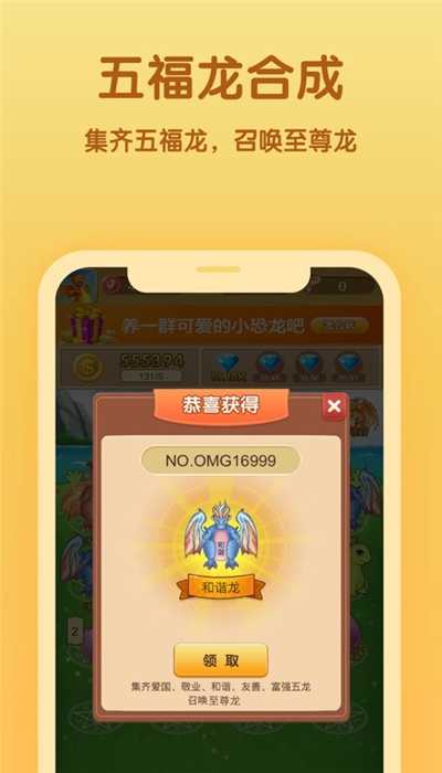 拖动合成恐龙,玩法魔性,风格新鲜,越高级恐龙获得的属性和权益越多!「算力龙」、「红包龙」、「分红龙」等你来体验,更多恐龙持续研发中~