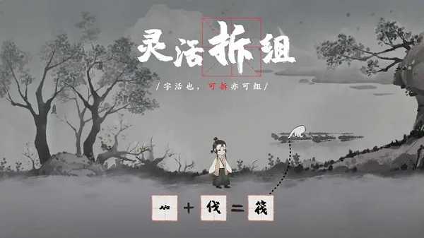 1、操作主角向右走,和士兵小哥对话完成之后,将士兵小哥和旁边的石头收集起来得到石和卒,将两个字结合成为碎,将碎字放到石头上
