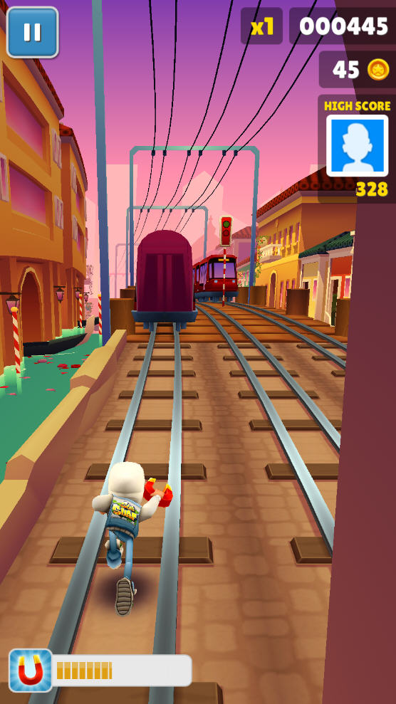 就像我们开头介绍的,你的目标是尽可能跑的远,同时还要尽可能多的收集铁轨上的金币,游戏的视角是面向角色前进的方向。