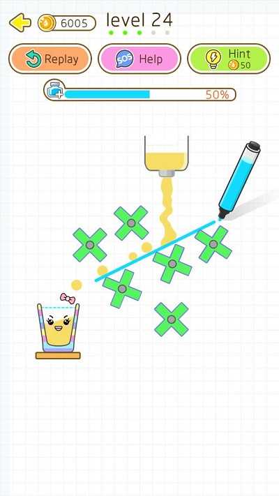 拿起你的画笔,画一条辅助线,让奶茶成功掉落在猫咪杯里。
