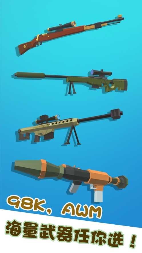 这款游戏里拥有众多挑战的场景,比如:天空、海洋等,玩家们通过搜集金币可以游戏商店里购买一把最牛的狙击枪来狙杀大boss,海量武器任你选择!带上你的98k,枪枪爆头!