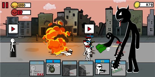 2、丰富多样的游戏兵种等待玩家体验,火柴人队长、士兵、大炮、掩体、狙击手、机枪兵等等。