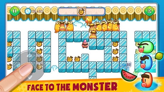 *箭头键控制角色移动,射击冰块诱捕敌人,让玩家体验更加丰富的游戏。