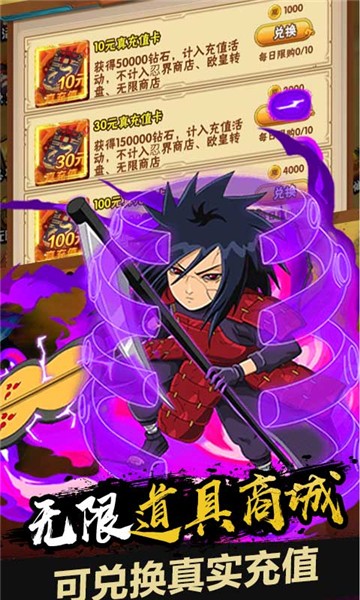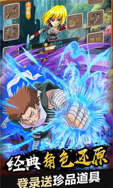 1、游戏内置超多福利,让你上线就跳过忍者考试,成为一个合格的忍者。