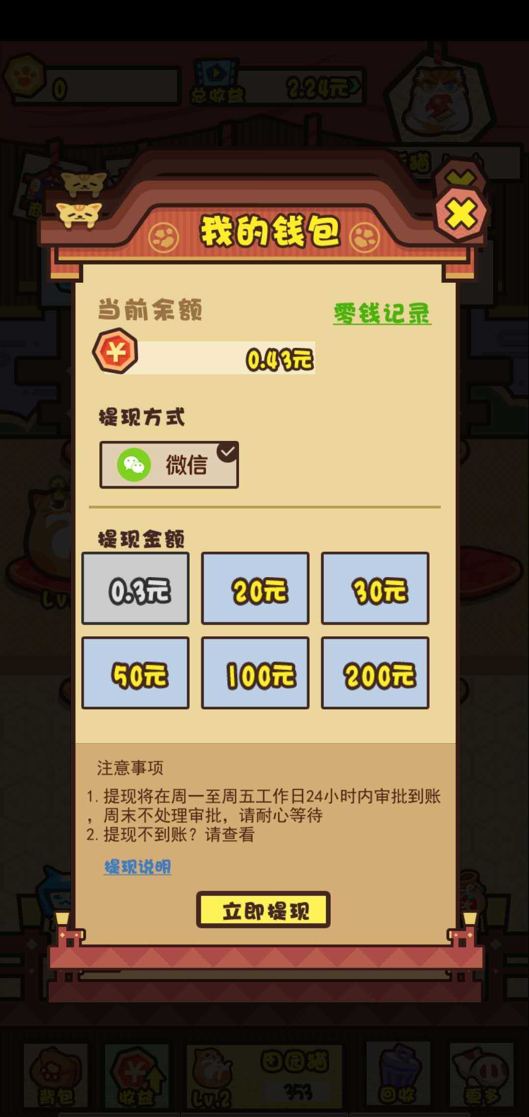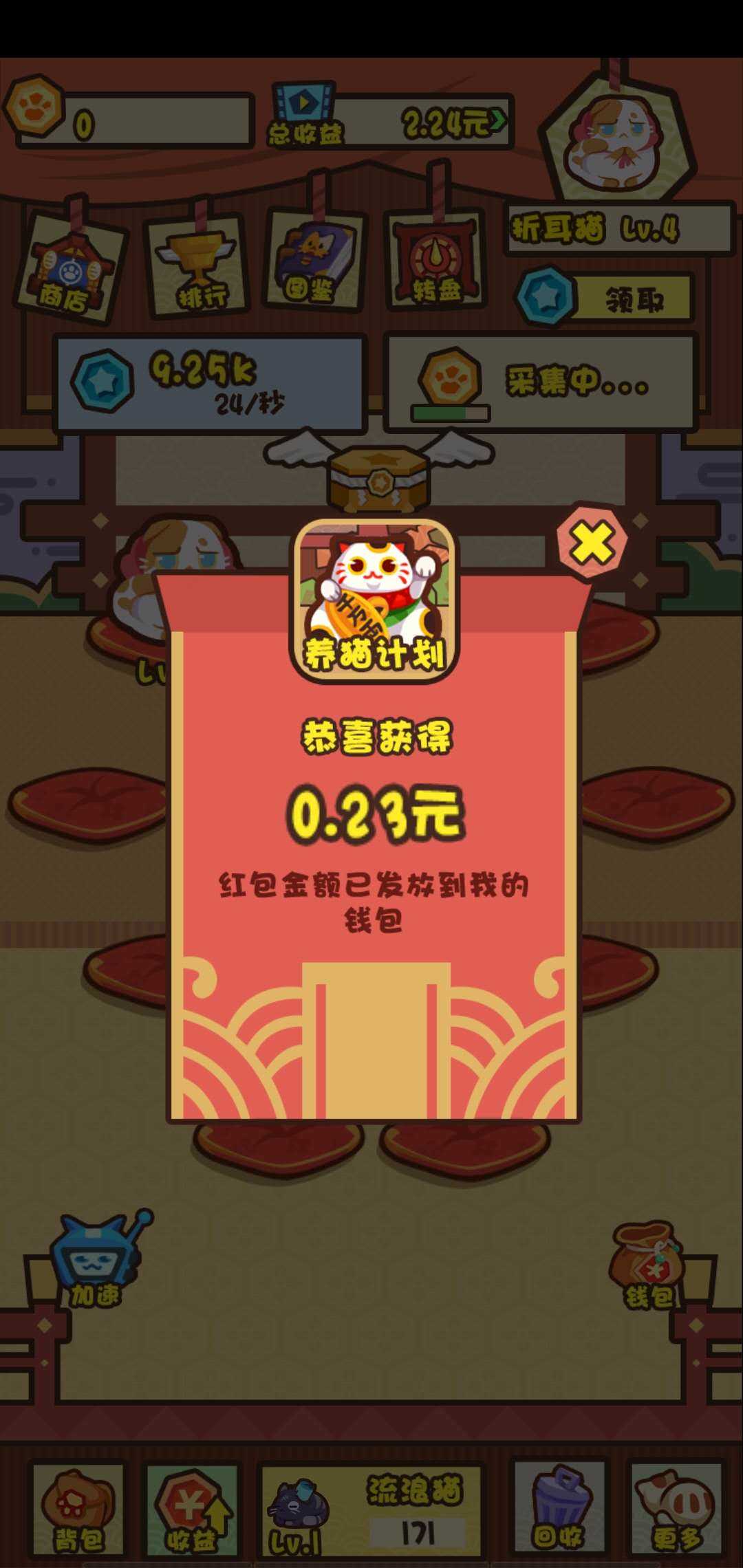 3、养猫计划红包版种当猫猫等级达到38级时,有几率合成分红猫,天天享受高额分红