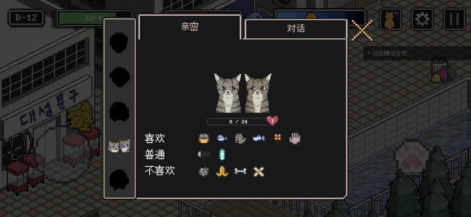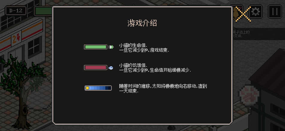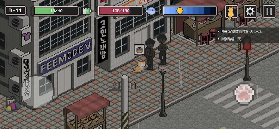 4、玩家将在游戏中与一只猫咪互动,多元化的玩法和简洁的像素主题风格,优秀的游戏界面和城市设置,为你加入了很多战斗元素,你将帮助在一旁翻垃圾桶的流浪猫路上的人开始照顾他们。