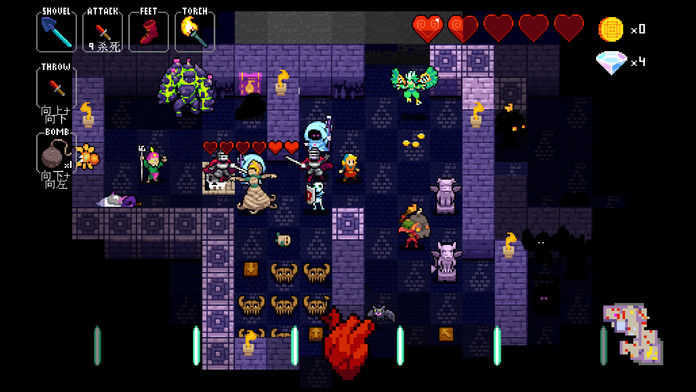 节奏地牢游戏中你只要伴随着音乐的节奏来控制你人物的行动,不需要过多的操作,拾取物品,攻击僵尸,购买道具这一切都不需要你来操作,只要将人物移动指定的位置即可。游戏时还是不要不要往怪堆里跑,被围殴可是很惨,尽量一个一个单独对付。怪物掉落的金币和钻石都捡起,可以用来提升装备武器,购买道具和血。