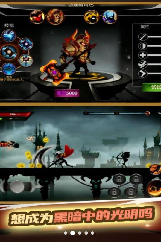 1、这款游戏中用你的武器装备来开启挑战和冒险,个性化十足的关卡中开启你的挑战。