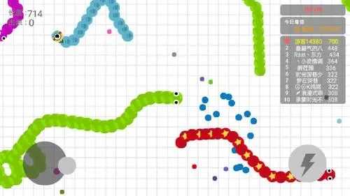 1.控制摇杆走位玩家的小蛇,吃掉地图上彩色的小光点,就会变长。