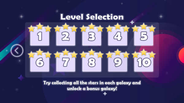 你在太空中遇到了迷路的顽皮小Moo,你需要帮助他穿越五彩斑斓的星系去往小Moo居住的遥远的星球,让小Moo一家团聚,通过解锁每个星系中的谜题收集星星,以此找到小Moo所居住的星球。收集所有星星,解锁位于Moo与他父母之间的隐藏星系,让Moo变得开心起来。找出正确的路线,小心不要碰到障碍物。